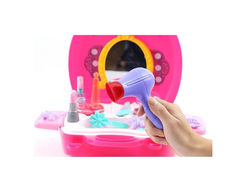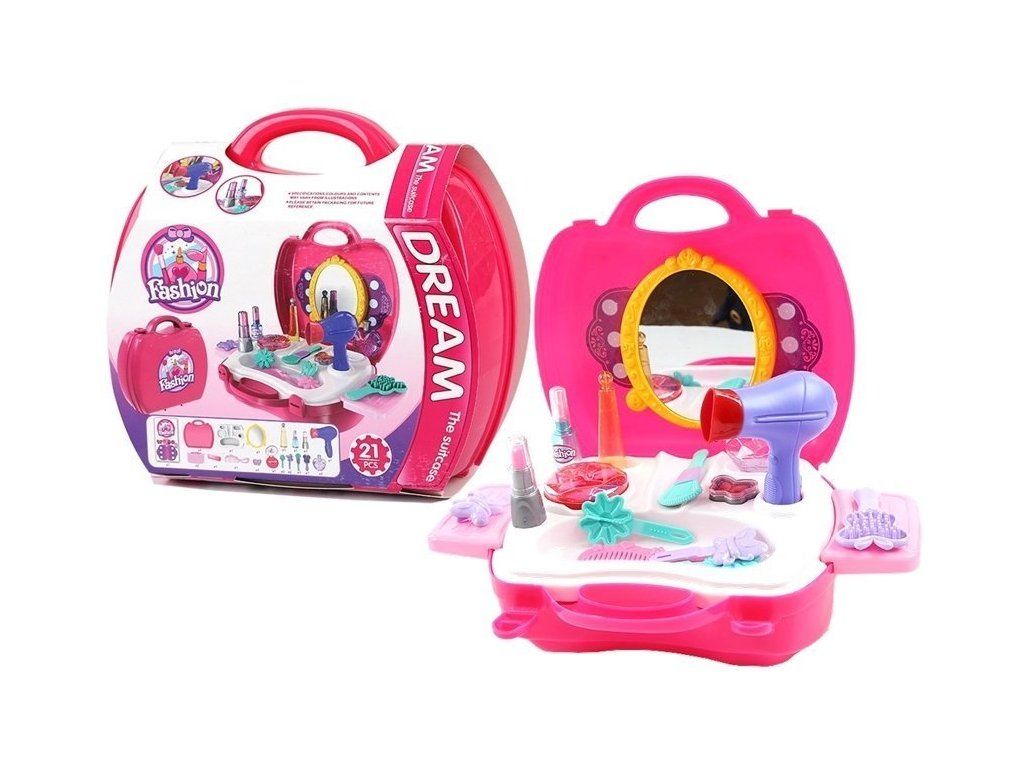Fantastico set cosmetico per piccole principesse. Lo specchio, i dettagli colorati e la lavorazione accurata incanteranno ogni giovane dama. L'intero set si chiude facilmente nella valigetta, così puoi portare il gioco ovunque con te.