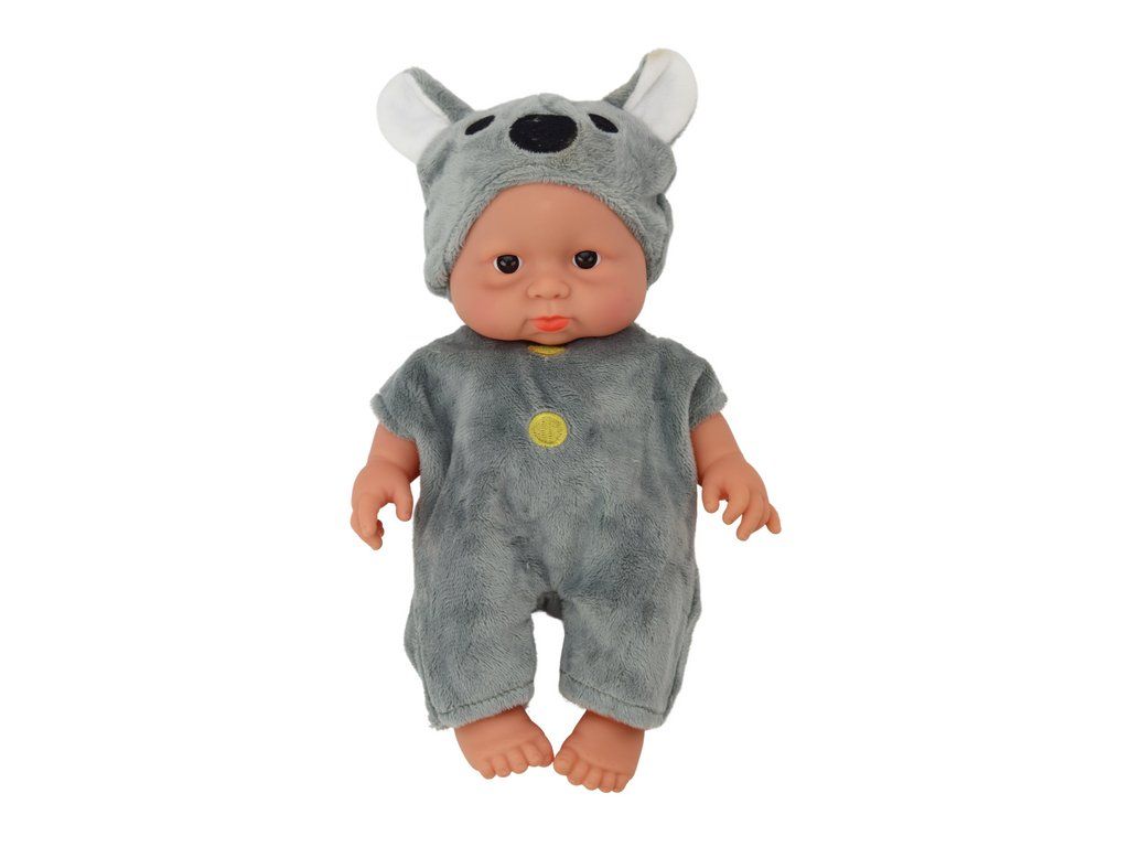 Piccola bambola per bambini in abito grigio e cappellino da koala