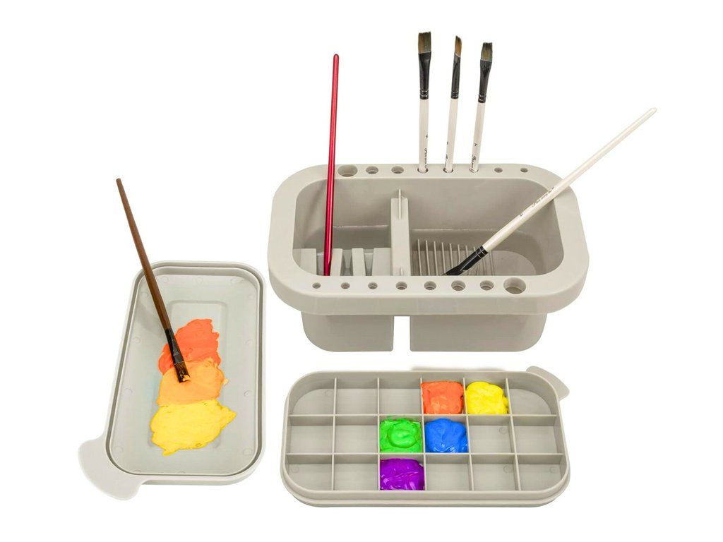 Il contenitore ha 16 aperture per pennelli di diverse dimensioni, posizionate lungo il bordo. Queste aperture speciali consentono di tenere i pennelli in posizione verticale, facilitando l'asciugatura e la conservazione durante il lavoro.