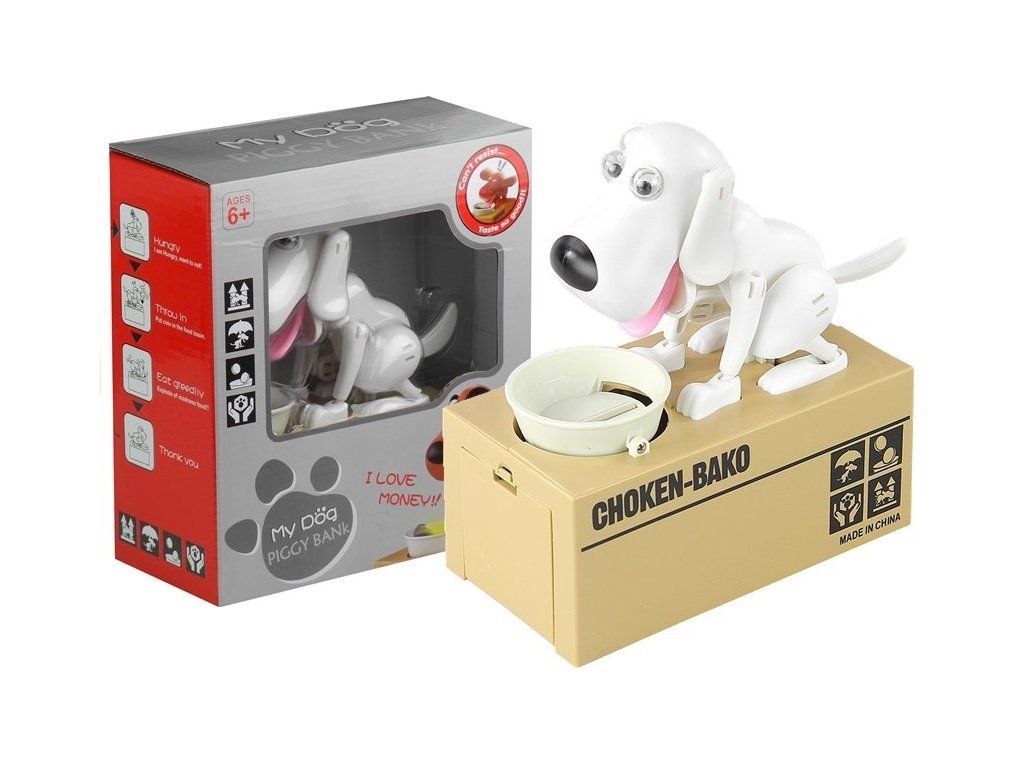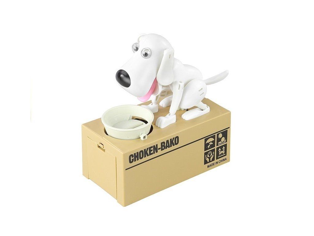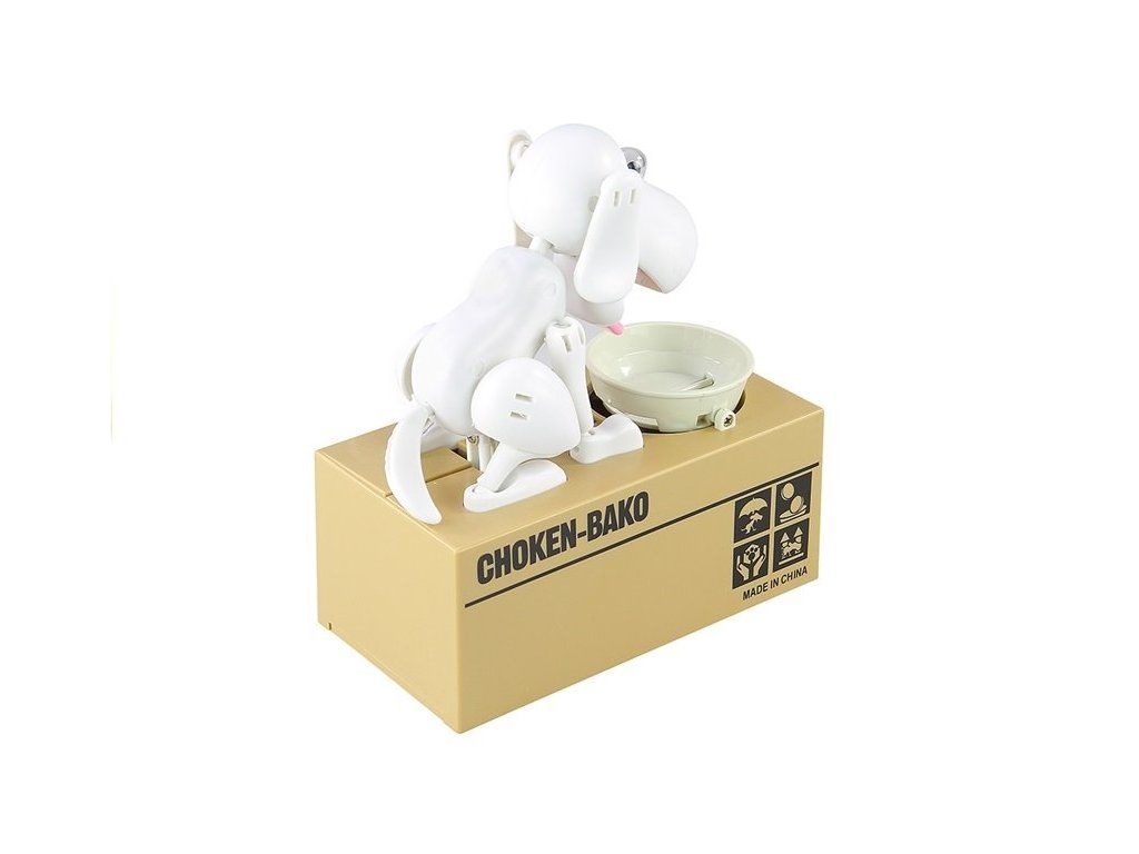 Contiene un grande scrigno per riporre i soldi, una ciotola mobile con un'apertura per le monete e un cane energico che reagisce muovendo occhi, orecchie, lingua e coda e emette suoni . Lo scrigno beige decorato con la scritta Choken-Bako e il cane con la lingua rosa, il naso nero e il colore bianco offrono divertimento ed estetica.