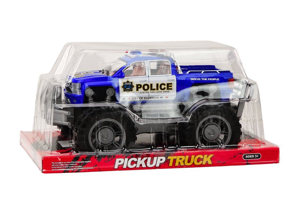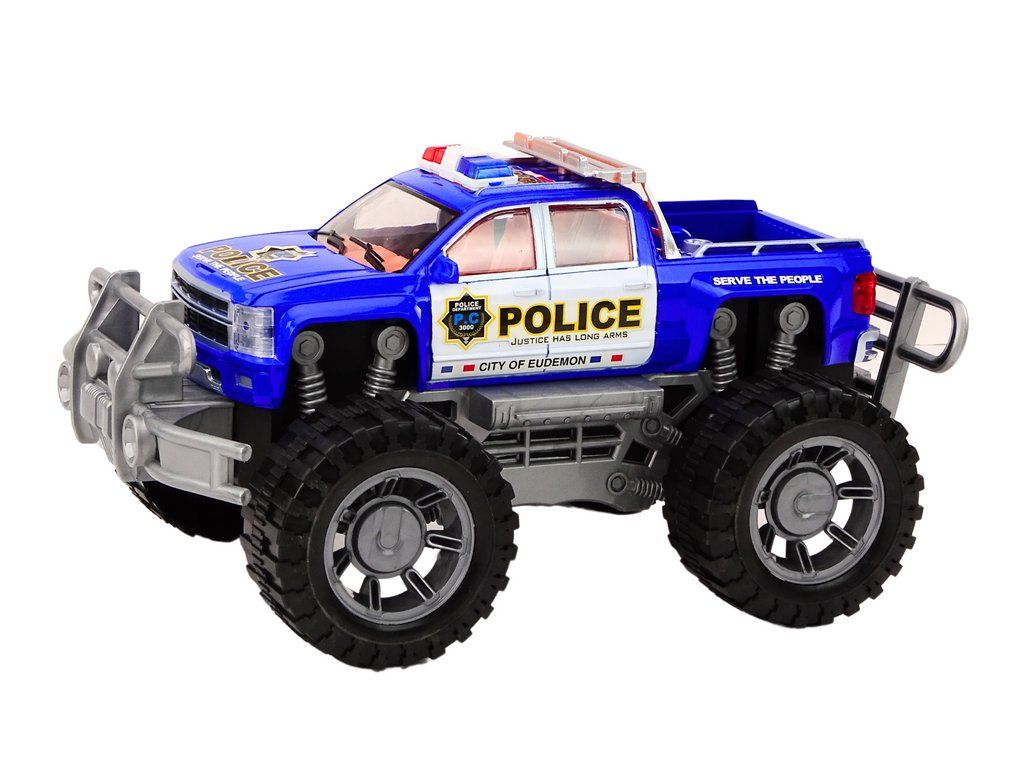 Il veicolo è dotato di grandi ruote nere da fuoristrada, che garantiscono un'ottima aderenza su diverse superfici, permettendo il gioco anche in condizioni più impegnative. La carrozzeria dell'auto è verniciata di blu e decorata con la scritta "POLICE", che ne conferisce autenticità. Sul tetto si trovano le luci lampeggianti della polizia, che sottolineano la sua funzione e il suo aspetto.